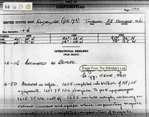 There was a big brain drain on Europe in the 1930's. Many Jewish and Nazi scientists were smuggled into the country. Much of this influx has been attributed to A. Duncan Cameron Sr. Although we know he had extensive connections, his exact relationship to intelligence circles is still a mystery. By 1941, Tesla had full confidence of the powers that be (FDR). A ship was procured on his behalf, and he had coils wrapped around the entire ship. His famous Tesla coils were also employed on the ship. However, he grew wary because as the project developed, he knew there would be problems with personnel. Perhaps he knew this due to his ability to fully visualize his inventions in his mind. In any case, Tesla knew that the mental state and bodies of the crew would be affected severely. He wanted more time to perfect the experiment. Von Neumann disagreed with this vehemently at the time and the two never got along. Von Neumann was a brilliant scientist but did not embrace metaphysics for its own sake. Metaphysics was old hat to Tesla, and he had built a successful legacy of inventions based upon his unique prescience. Part of what made his views so controversial was that during his experiments in Colorado Springs, circa 1900, he said that off planet intelligence had contacted him via consistent signal messages when Mars approached. This also occurred in 1926 when he had radio towers erected in the Waldorf Astoria and at his New York city lab. He claimed to receive information that he'd lose people if things were not changed. He needed time to design new equipment. Tesla's requests for more time were not heeded. The government had a war to win and additional time was not granted. Tesla went through the motions but secretly sabotaged the operation in March 1942. He was either fired or quit. He is supposed to have died in 1943, but there is arguable evidence to suggest he was wicked off to England. A look-alike derelict is supposed to have been put in his place for the funeral. He was cremated the day after his body was found which was not in keeping with the tradition of his family's orthodox faith. Whether or not he died is controversial. That secret papers were removed from his safe has never been in question. Von Neumann was named director of the project. He did a study and determined that two huge generators would be required for the experiment. The keel for the USS Eldridge was laid in July 1942. Tests were done at dry dock. Then, in late '42, von Neumann decided that the experiment could be fatal to people, just as Tesla had suggested. Ironically, he still got upset at the mention of Tesla's name. He decided a third generator would do the trick. He had time to build one but never got the third one to synchronize with the other two. It never worked because the gear box was incompatible. The experiment went out of control and a Navy technician was zapped, went comatose for four months and left the project. They pulled out the third generator. Von Neumann wasn't satisfied, but his superiors weren't going to wait any longer. In July 20, 1943, they decided it was ready and made tests. Duncan Cameron Jr. and his brother, Edward, were in the control room to operate it. The ship was no longer at anchor and orders came by radio to turn it on. Fifteen minutes of invisibility ensued. There were immediate problems with people. They got sick, some experiencing nausea. There were also mental illnesses and psychological disorientation. They needed more time, but the final deadline was given for August 12th, 1943. The orders came from the Chief of Naval Operations, and he said he was only concerned with the war. Trying to avoid damage to individuals involved, von Neumann tried to modify the equipment so that only radar invisibility would be achieved, not literal sight invisibility. Six days before the final test on the Eldridge. However, for three to six minutes, things looked good. It appeared it might work without any devastating effects. They could see the outline of the ship - everything was gone. There were problems. The principal radio mast and the transmitter were broken. People were jammed in the bulkheads. Others were walking around in an insane state. Duncan and Edward Cameron did not suffer the same trauma as their shipmates. They had been shielded in the generator room which was surrounded by steel bulkheads. The steel acted as a shield to the RF energy. As they witnessed things falling apart, they tried to shut off the generator and transceivers but were unsuccessful. Ships Log - Notice the Date! |