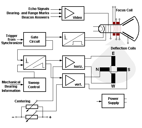 Synchronizer of the Intensity Gate GeneratorThe intensity gate generator provides a gate which unblanks the crt during sweep periods. The intensity of the trace appearing on the crt is determined by the dc level of this gate. This circuit is also synchronized by the gate circuit. Video AmplifierThe video amplifier circuit amplifies the video signal from the receiver and applies it to the crt intensity-modulating element (control grid). At this a balanced relationship is necessary between brightness and contrast. The brightness of the grid of the azimuth- and range marks should be adjusted very weakly. Sweep Control CircuitTo synchronize sweep rotation with antenna rotation, you must convert antenna azimuth (bearing) information into electrical signals. These signals, usually provided by synchros, control the amplitudes and polarities of the sawtooth sweep currents applied to the deflection coils. The amplitudes of the sawtooth sweep currents are varied sinusoidal (like a sine wave), corresponding to the rotation of the antenna. Sawtooth- Generator![]() The sweep generator circuit produces currents which deflect an electron beam across the crt. Varying voltages from the sweep control circuit are applied to deflection coils. Gate voltages determine sweep rate, and therefore, the effective distance (range) covered by each sweep.